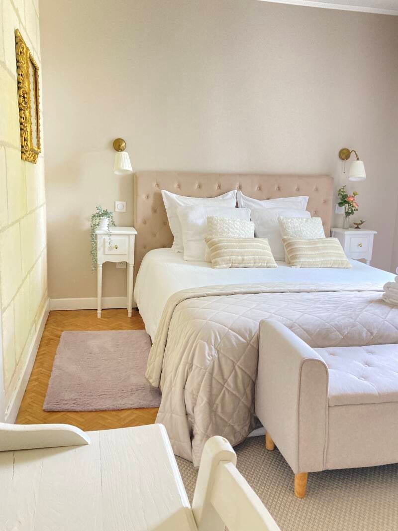 La première chambre est composée d'un lit queen size et d’une armoire de rangement. Elle comporte un bureau pour ceux qui auraient besoin de rester connectés et de travailler un peu pendant leur séjour dans notre gîte en Touraine.