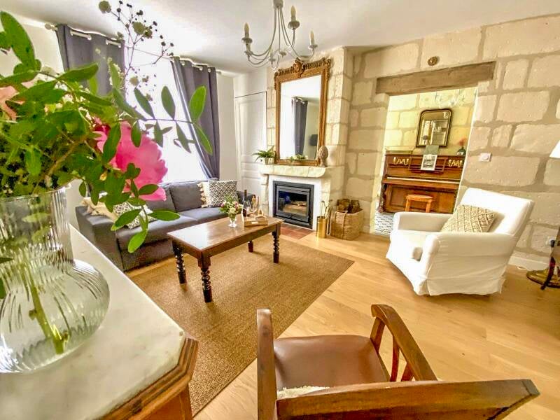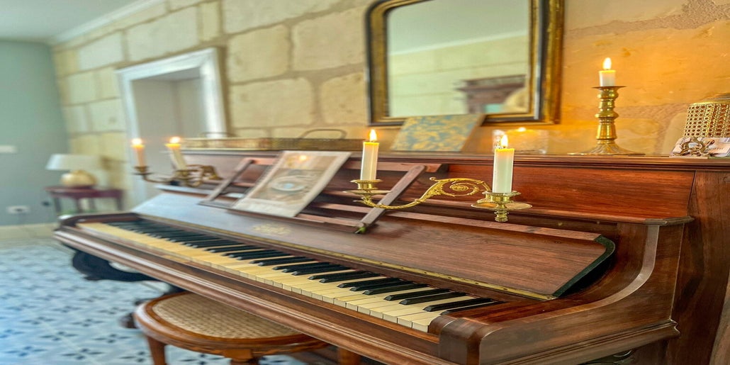 Les carreaux de ciment au sol, les murs en pierre de tuffeau, le piano de famille apportent une atmosphère chaleureuse et raffinée.